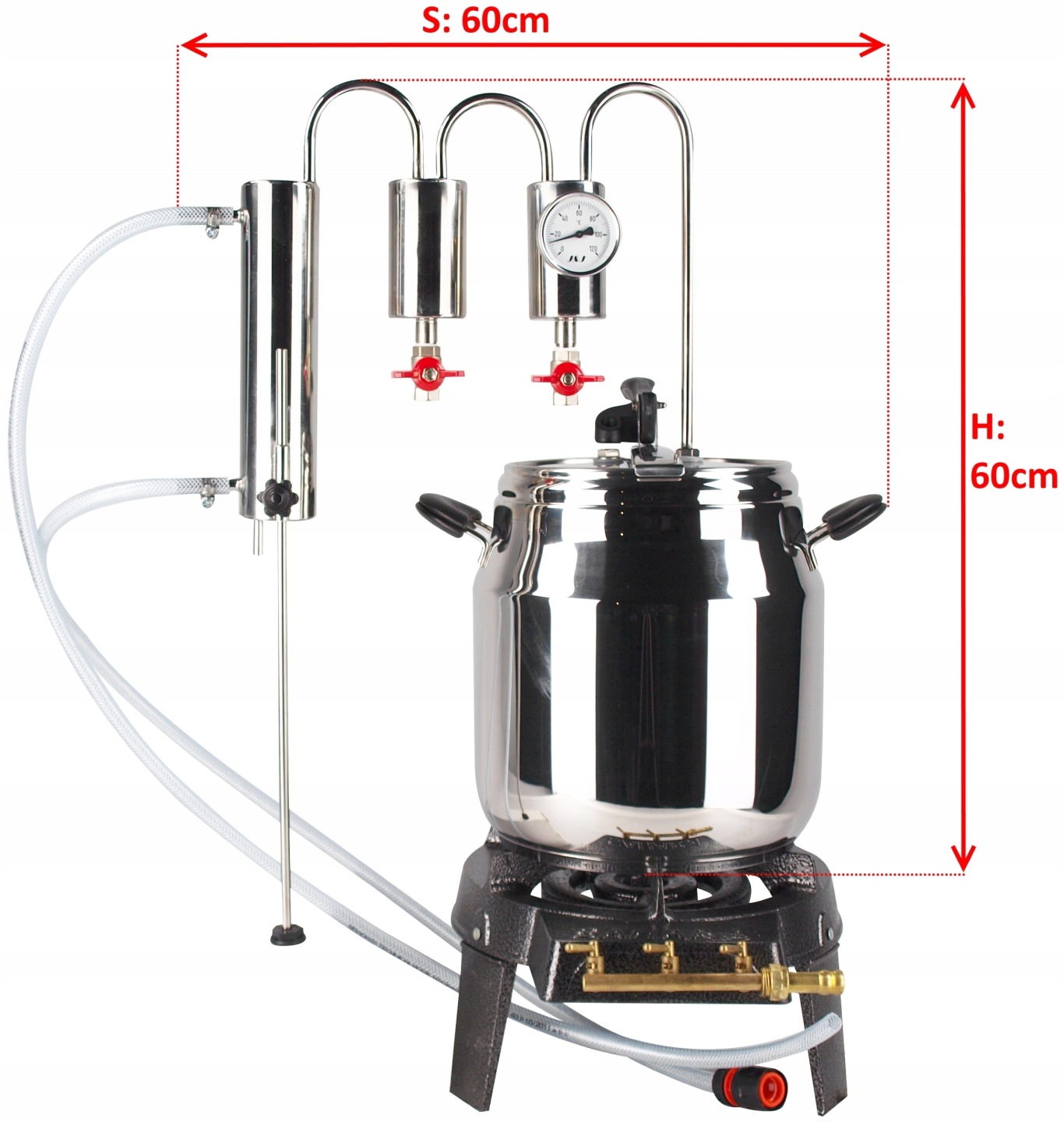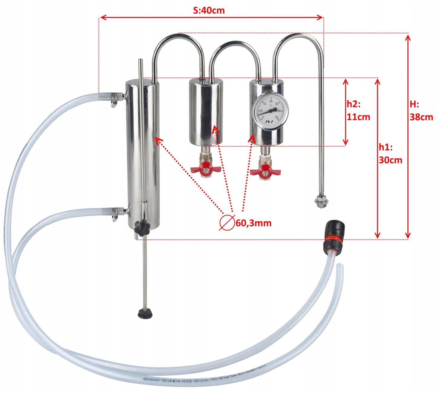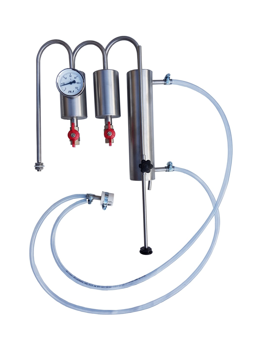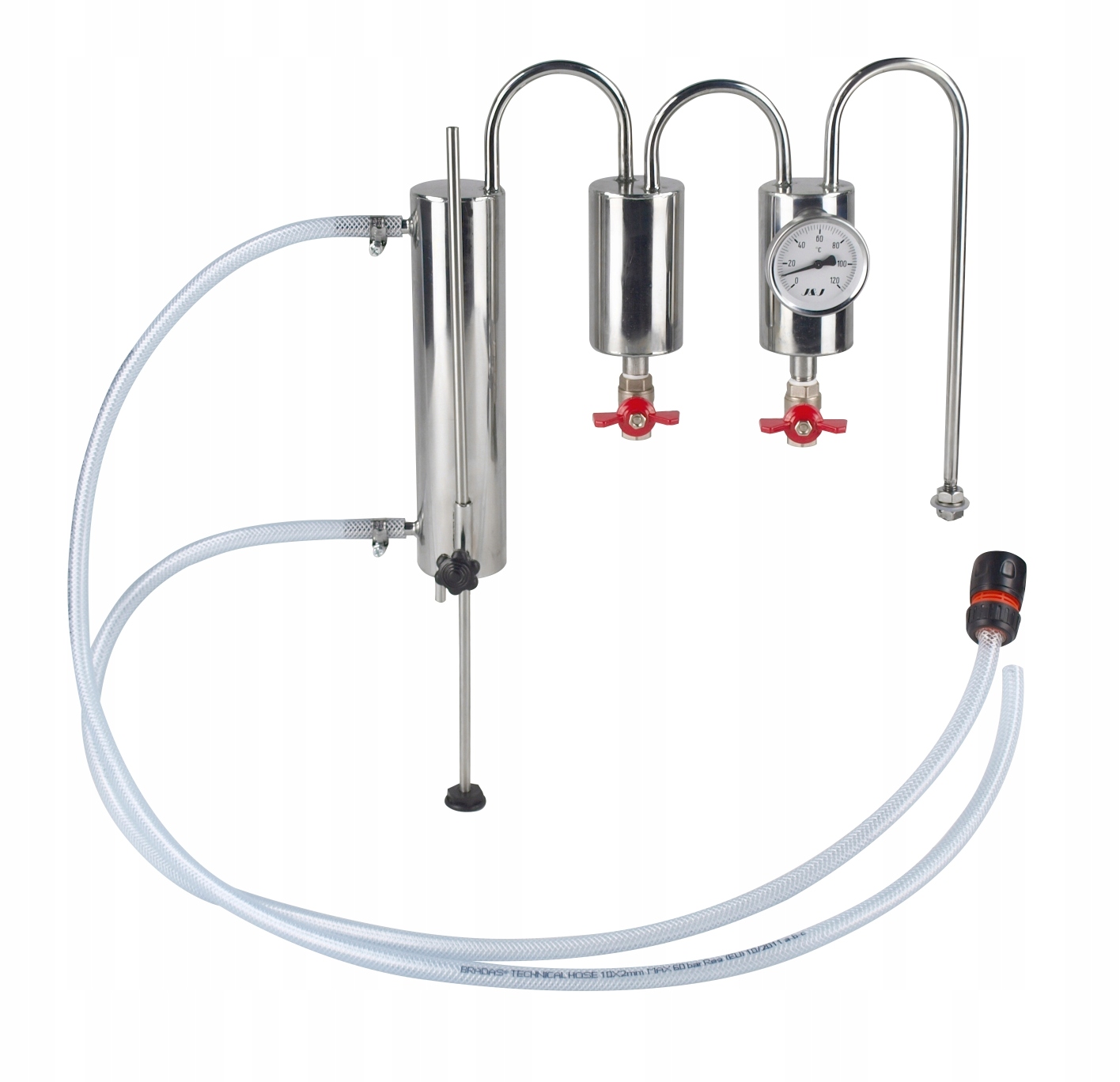 Chłodnica destylacyjna z dwoma odstojnikami, w każdym odstojniku znajduje się zawór spustowy i sonda na termometr, za odstojnikami znajduje się chłodnica z wężownicą 2,5m wykonaną z rury fi8x1 osadzona w rurze 60,3mm. Do zestawu dodajemy regulowaną podpórkę stabilizującą, oraz komplet węży, złączek i uszczelek do podłączenia wody i szybkowaru lub innego posiadanego zbiornika