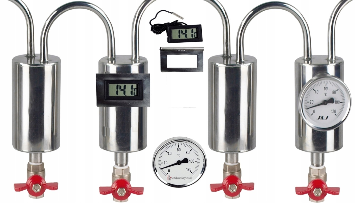 - Termometr analogowy lub cyfrowy – klient wybiera rodzaj termometru. Dzięki zastosowaniu termometru mamy pełna kontrolę nad temperaturą oparów wchodzących do chłodnicy co ułatwia nam regulację mocy % końcowego produktu. W sprzedaży posiadamy również wersję z termometrem elektronicznym.
