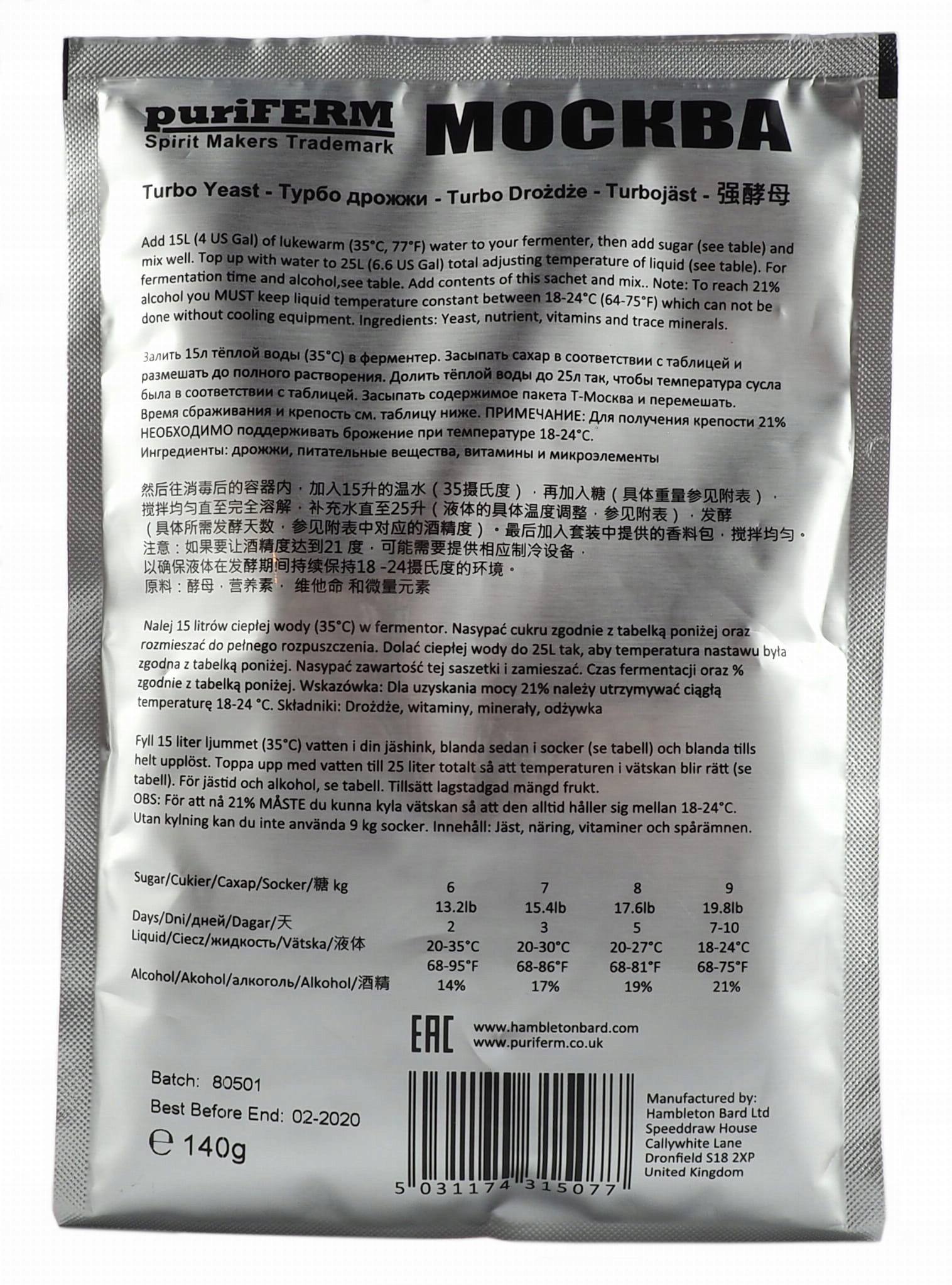 Dodać 15 litrów ciepłej wody (35°C) do kadzi fermentacyjnej, a następnie dodać cukier (według tabeli poniżej) i mieszać aż do całkowitego rozpuszczenia. Dolać wody tak by było w sumie 25 litrów oraz temperatura wody była właściwa, dodać zawartość saszetki i wymieszać. NIE STOSOWAĆ RURKI FERMENTACYJNEJ. Czas fermentacji i moc alkoholu zawarta w tabeli.