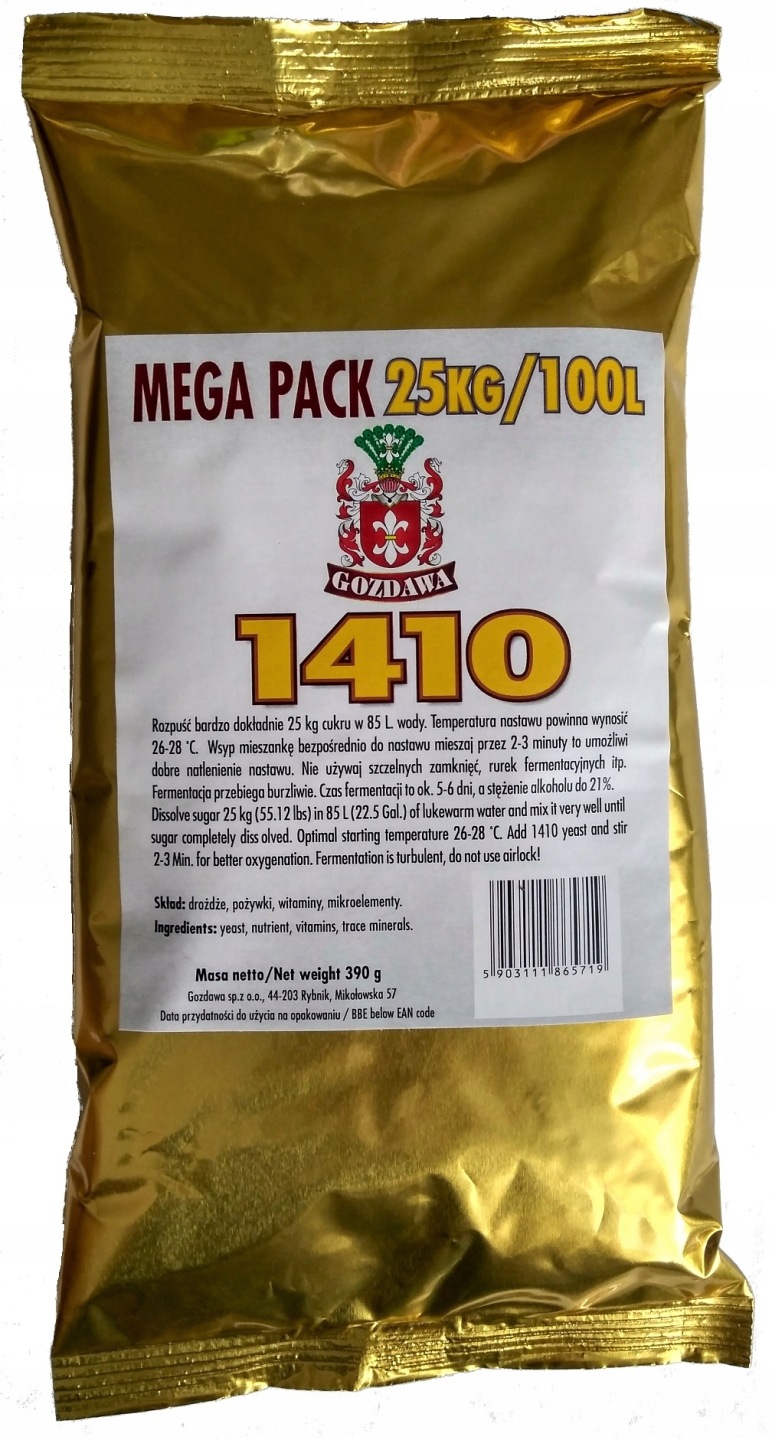 Aktywne drożdże gorzelnicze typu turbo „GOZDAWA 1410 MEGA PACK” – przerobią 25kg cukru w 6 dni dając 100l zacieru 21% – produkt polski renomowanego producenta