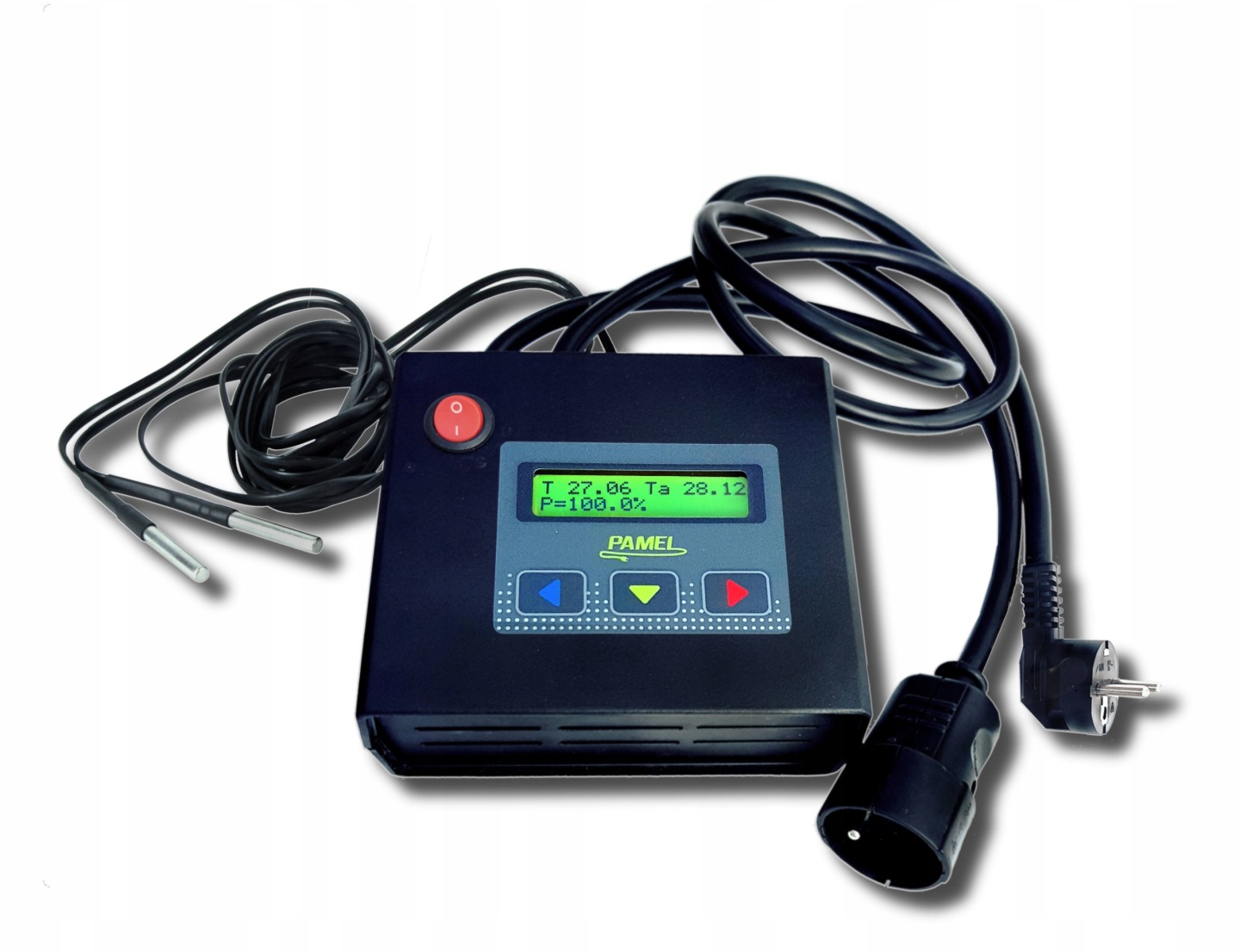 Kompletny sterownik automatyzujący do destylatora/wędzarni – uzbrojony w solidne przewody przyłączeniowe z wtyczkami oraz w dwie sondy po 2m.